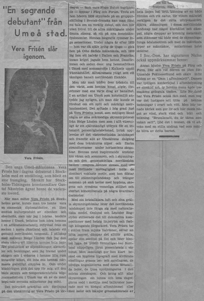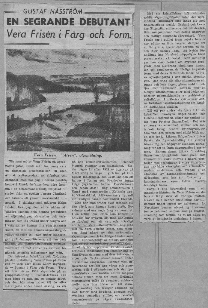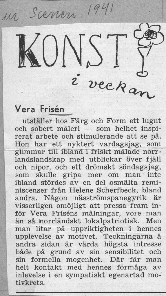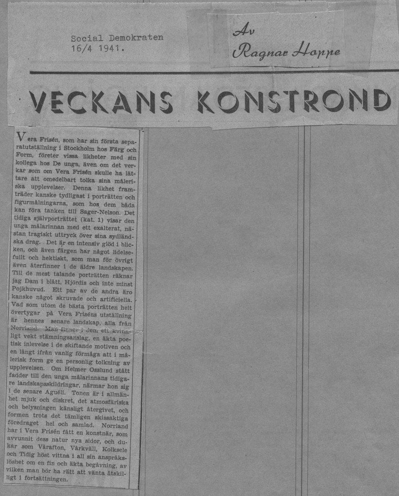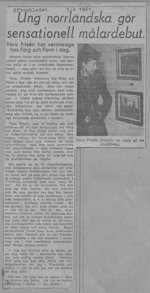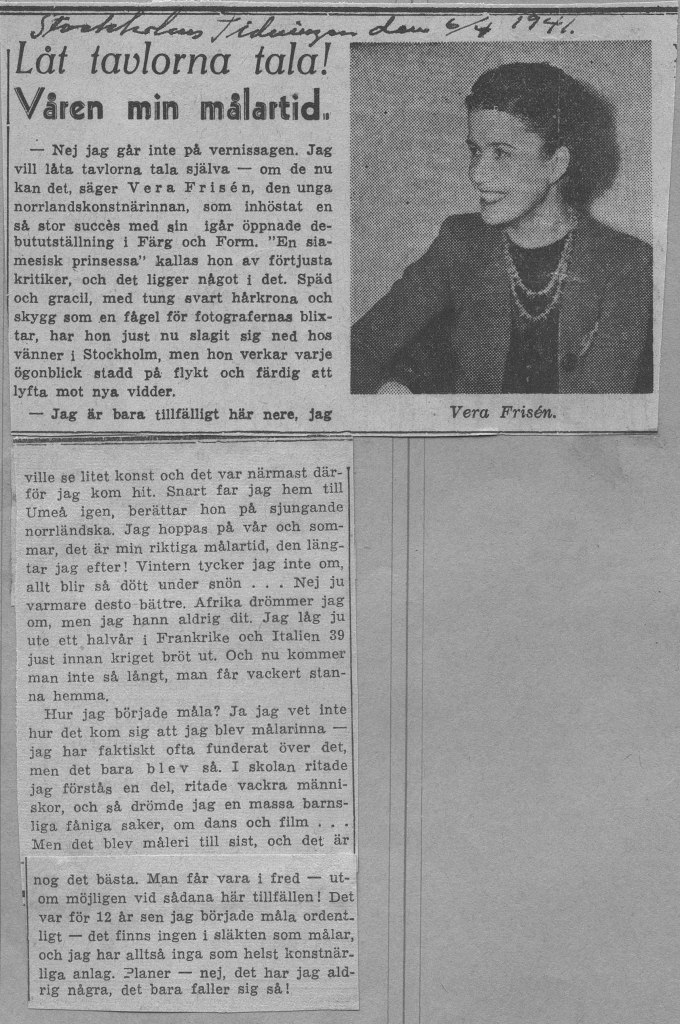Veras debututställning ägde rum på Färg och Form april 1941. Framgången var monumental. Både försäljnings- och kritikermässigt. Nästan alla ca 70 dukar såldes. Nedan har vi samlat det mesta som pressen skrev om utställningen när det begav sig.