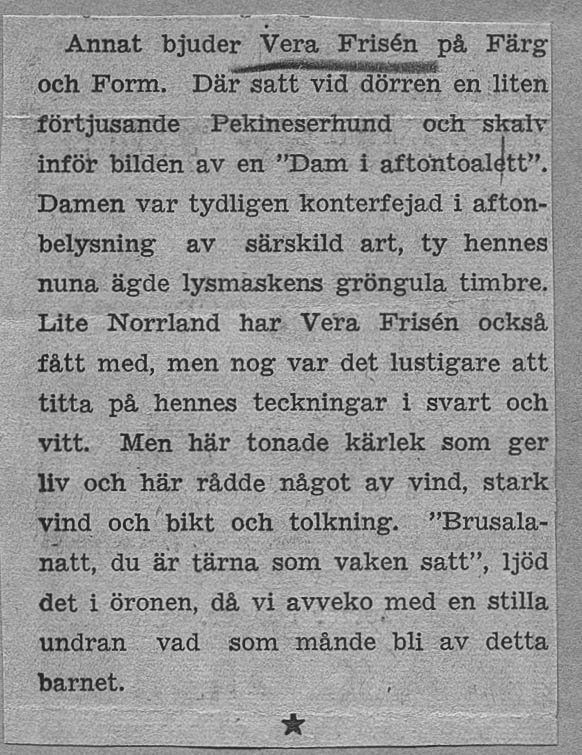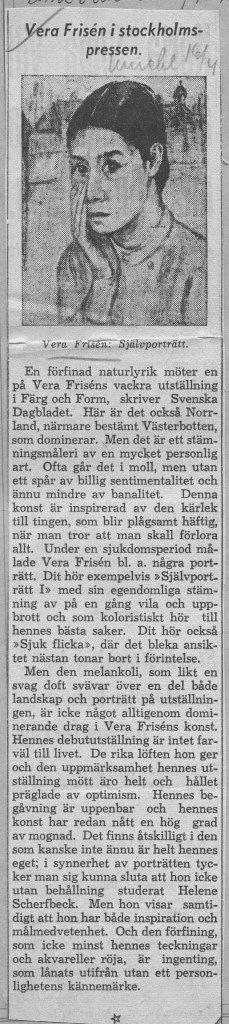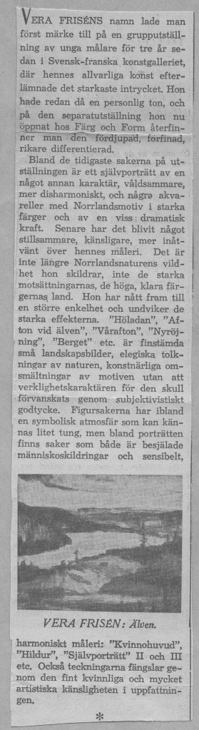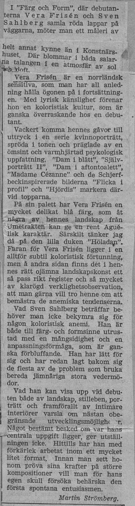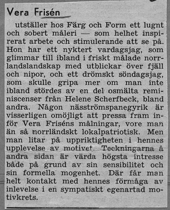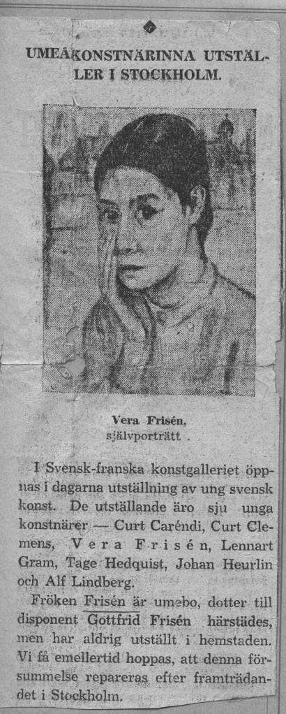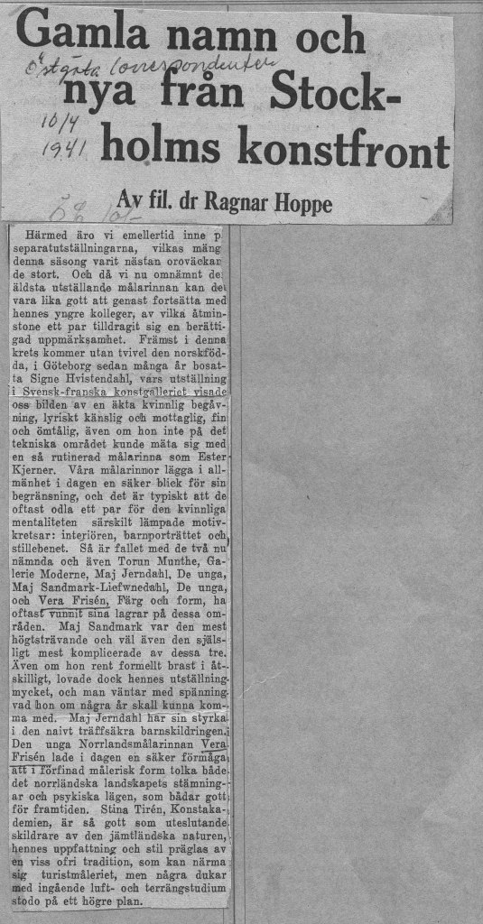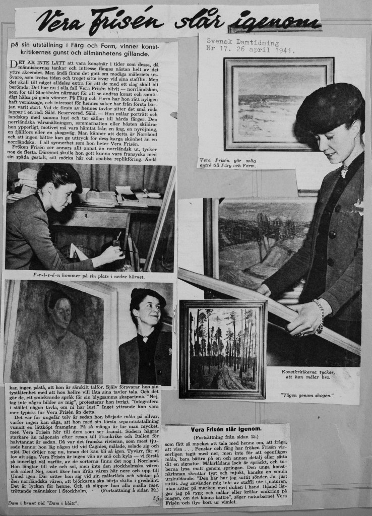 Veras debututställning ägde rum på Färg och Form april 1941. Framgången var monumental. Både försäljnings- och kritikermässigt. Nästan alla ca 70 dukar såldes. Nedan har vi samlat det mesta som pressen skrev om utställningen när det begav sig.